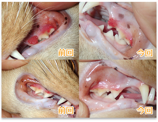 通院するためケースに入れようとすると、ケージ内のトイレに逃げ込み捕まえてそのままケースに入れました。 捕まえようとした時に一度”シャー”と威嚇されたけど、猫パンチや噛みつき攻撃はしなくお利口さんでした。 ゴンを含めモンチたち三匹は威嚇しても猫パンチなど攻撃的な行動を今まで一度も取った事がないので、ぼくも信頼して捕まえる事ができます。 今回もネットに入れないで普通に診察できました。 とっても嬉しい事です。 前回よりも歯茎の赤みがなくなり、腫れも少し小さくなった感じでした。 局部麻酔してこの腫れを切除しました。 この時もおとなしくしてくれました。 前回と同じ注射を打ってもらい帰宅。 次回も3週間後に通院となりました。 ついでになつの酔い止めを処方してもらいました。 怪我や病気を負った猫を見かけたらどうすれば良いか病院へ聞いてみました。 市の補助で3日間の診療費は補助がでるそうです。 しかし3日以上は保護した人の負担。 先日見かけた猫の場合、仮に足を切除した場合外の世界で生きていけないような場合は保護した人が引き取るか安楽死。 やっぱりそうなりますよね… うちの場合猫狩り幼稚園があるので、先日見かけた猫が園内に入ったら身体が不自由で素早い動きができないので捕まって袋叩きにされそうです… あれからあの猫は見かけていません。 ・体重 5.1kg ・診療代 6,160円 明細 再診料 540円 注射料(抗生剤、2週間作用持続)3,800円 内服薬(なつの酔い止め2回分)1,820円 歯茎の具合。 PR コメントを投稿する