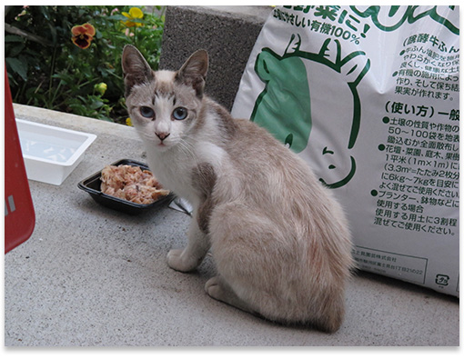 子猫が四匹と母猫と白い子とおんぢくんがスタンバイしていました… こっちに引っ越し後しばらくしてからモンチを含む子猫を五匹くらい見かけた事を思い出しました。 昨日は子猫は三匹だったけど今日は四匹もいて、猫の間でここにくれば美味い物が食えるぞ!と噂になって集まってきたのでしょうか… 猫ってどんな手段を使って会話しているんでしょうね。 一度その会話の輪に入ってみたいです。 しかしご飯をあげるのはいいけど、この子猫達が順調に育ってくれていずれ子供ができたら ”この子達にもご飯を頼む” と連れてこられた時の事を考えると大変そうです… みんな避妊手術や去勢手術なりできれば良いけど、現在では触る事もできないので捕獲ができません。 どーしたら良いのでしょうか… 昔ミャーちゃんがまだノラ猫だった頃、子供が生まれたと言った感じで子猫をくわえて見せに来た事があったそうです。(母談) 四匹の子猫を見てミャーちゃんの事を思い出しました。 まずはおんぢくんのでっかいタマタマをなんとかしないとです。 写真はノラ猫時代公園で生活していたちーちゃん。(2002年8月撮影) 一緒に写っている猫は当時ちーちゃんとユキちゃんの面倒を見てくれていたパンダくん。 このパンダくんは元々は飼い猫だったが飼い主に懐かず飼い主に捨てられたと言うか、パンダくんが飼い主を捨てて飛び出したようです。(飼い主から話しを聞いてとんでもない飼い主と判明) 毎晩ご飯をあげにいくと膝の上に乗ってゴロゴロしてくれとても懐いてくれ、面倒見の良いお利口な猫さんでした。 今うちにいるパンダくんはこの子の名前を引継ぎました。 PR 仮住まい先へご飯を置きに行くのを昨日で終了としました。